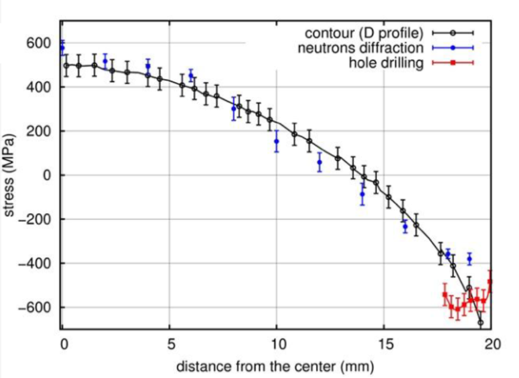 Les contraintes résiduelles après trempe ont été déterminées par la méthode du contour, récemment introduite (coll. Mat-In-Méca), pour obtenir leur distribution dans le plan médian. La diffraction de neutrons (coll. HZB, Berlin) a permis d’obtenir un profil radial de contraintes en excellent accord avec la méthode du contour.
