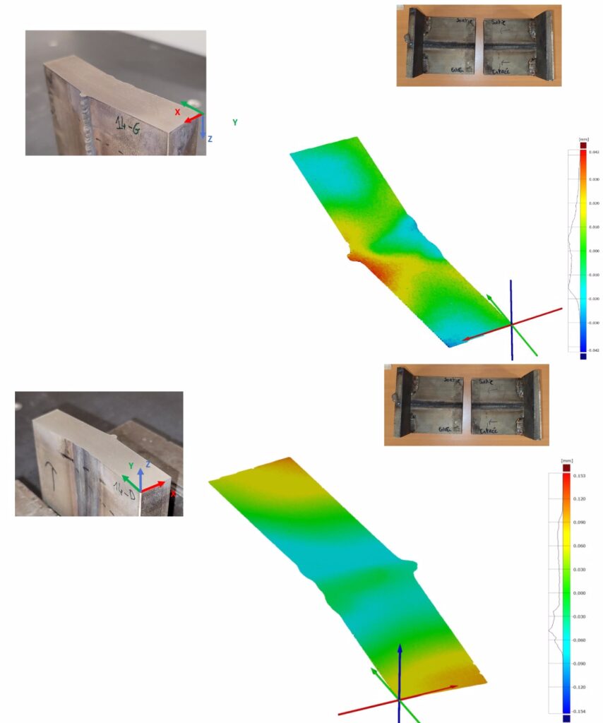 Les déformations longitudinales au plan de découpe sont mesurées pour chaque demi-pièce (la couleur représente la valeur en déformation sur l’image)