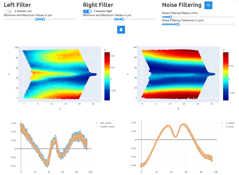 Filtrage manuel et automatique des données brutes expérimentales afin de réduire le bruit (artefacts de découpe, rugosité, rupture de fils).