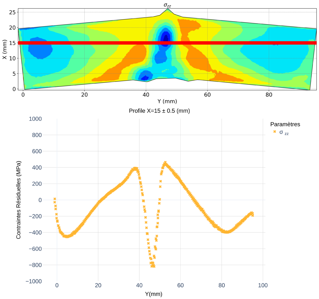 Une cartographie qui représente les résultats finaux obtenus par la méthode du Contour : les contraintes résiduelles longitudinales au plan de découpe de la pièce. Il est possible de tracer plusieurs profils sur les zones d’intérêts (notamment pour zoomer sur la Z.A.T d’une soudure)